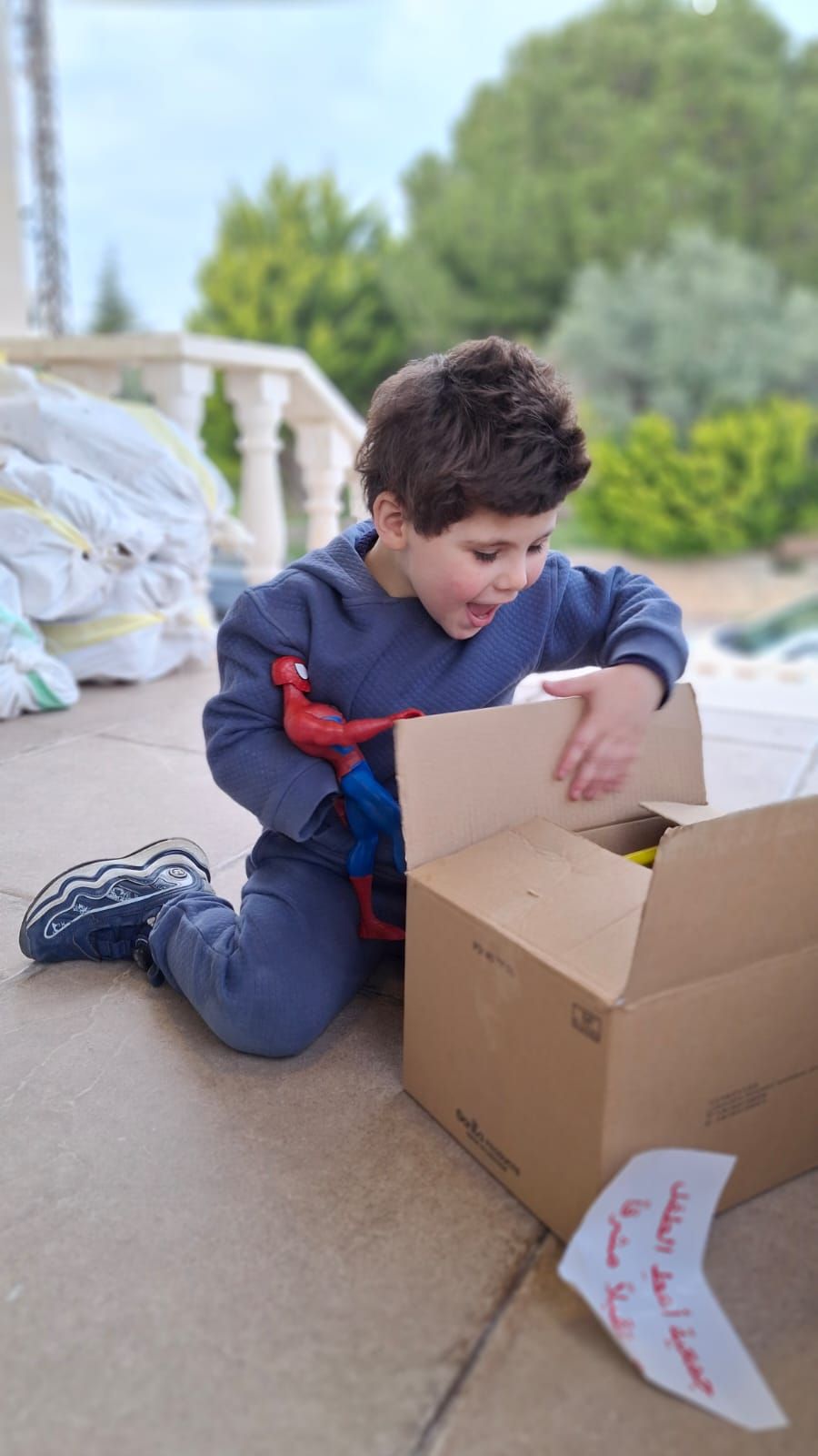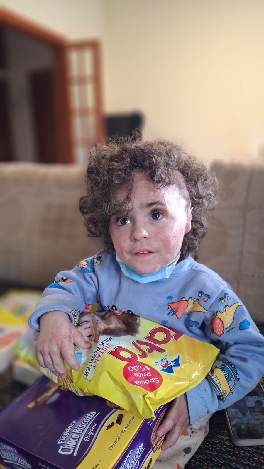 Ali, just four years old, has already experienced unimaginable loss, having lost his parents and siblings. Now displaced, small moments of comfort, such as receiving a toy or opening a box of supplies, become deeply meaningful.